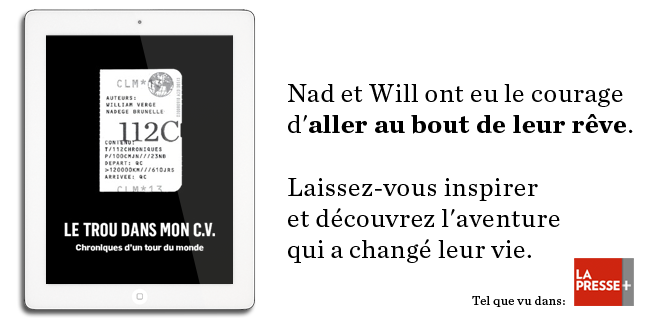 Nad et Will, début vingtaine et diplômes en poche, décident en 2008 de troquer la routine débilitante d’une vie d’adulte contre un tour du monde au gré du vent, pour vivre notre planète et découvrir ses splendeurs et ses revers. Vous deviendrez rapidement accro aux épopées de notre couple d’aventuriers, relatées avec humour et en toute complicité. Basé sur les chroniques qui ont alimenté leur blogue, « Le trou dans mon C.V. » est un carnet de voyage qui se veut informatif mais léger, rafraîchissant et fort sympathique!